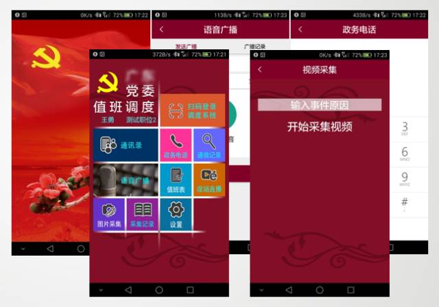 移动调度APP根据不同手机使用者的权限,实现对通讯录功能、政务电话、语音通播、现场视频采集功能、现场照片\录音采集功能、查看值班室通信记录、执行值班表管理。