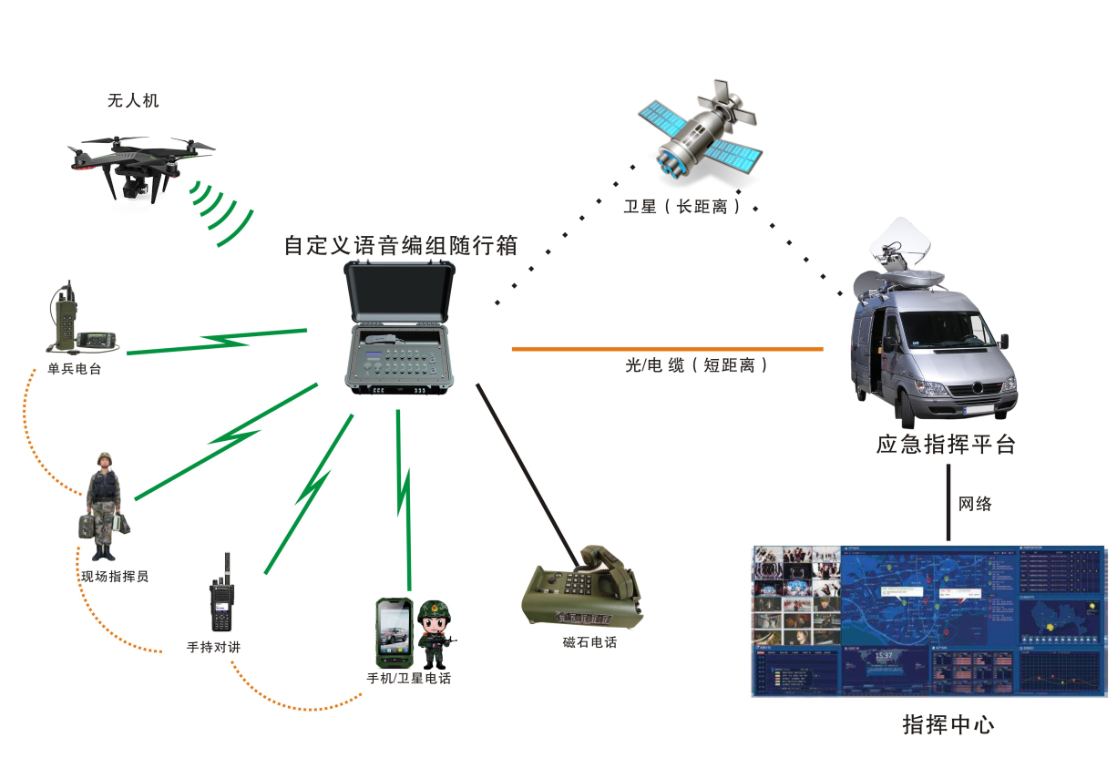 ●350M对讲机、公网集群对讲机、公专融合智能对讲机、远程语音通信电台、卫星电话、超短波对讲机、短波电台、手机、固定电话、卫星电话、网络电话、磁石电话、功放喇叭等混合方式接入。