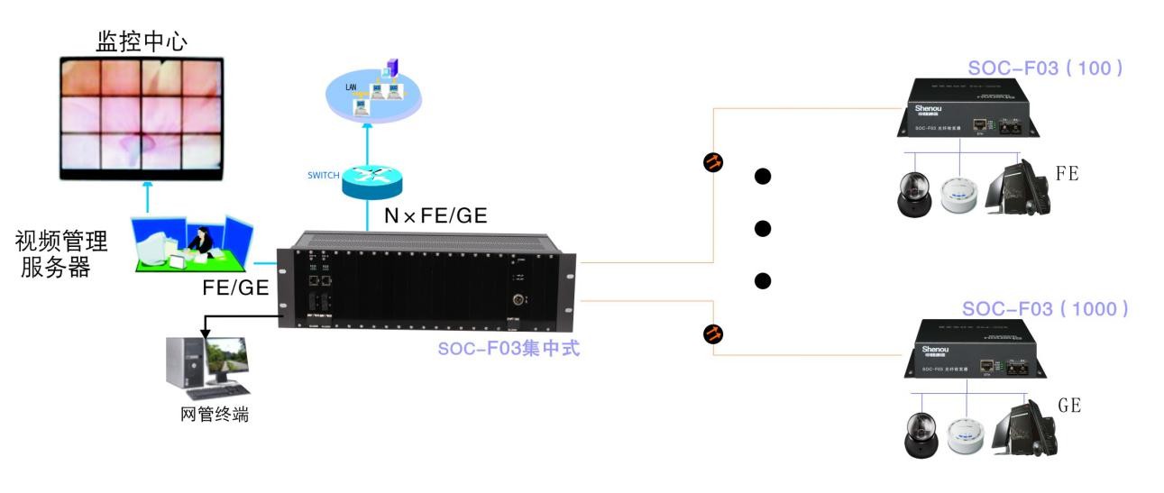 该方案局端放置一台SOC-F03集中式业务,下放以太网(FE/GE)业务口,与各个远端之间通过光纤直连,远端放置SOC-F03桌面式设备,下放以太网业务口。可统一纳入SOC-NM2005网管平台,提供完善的网管功能